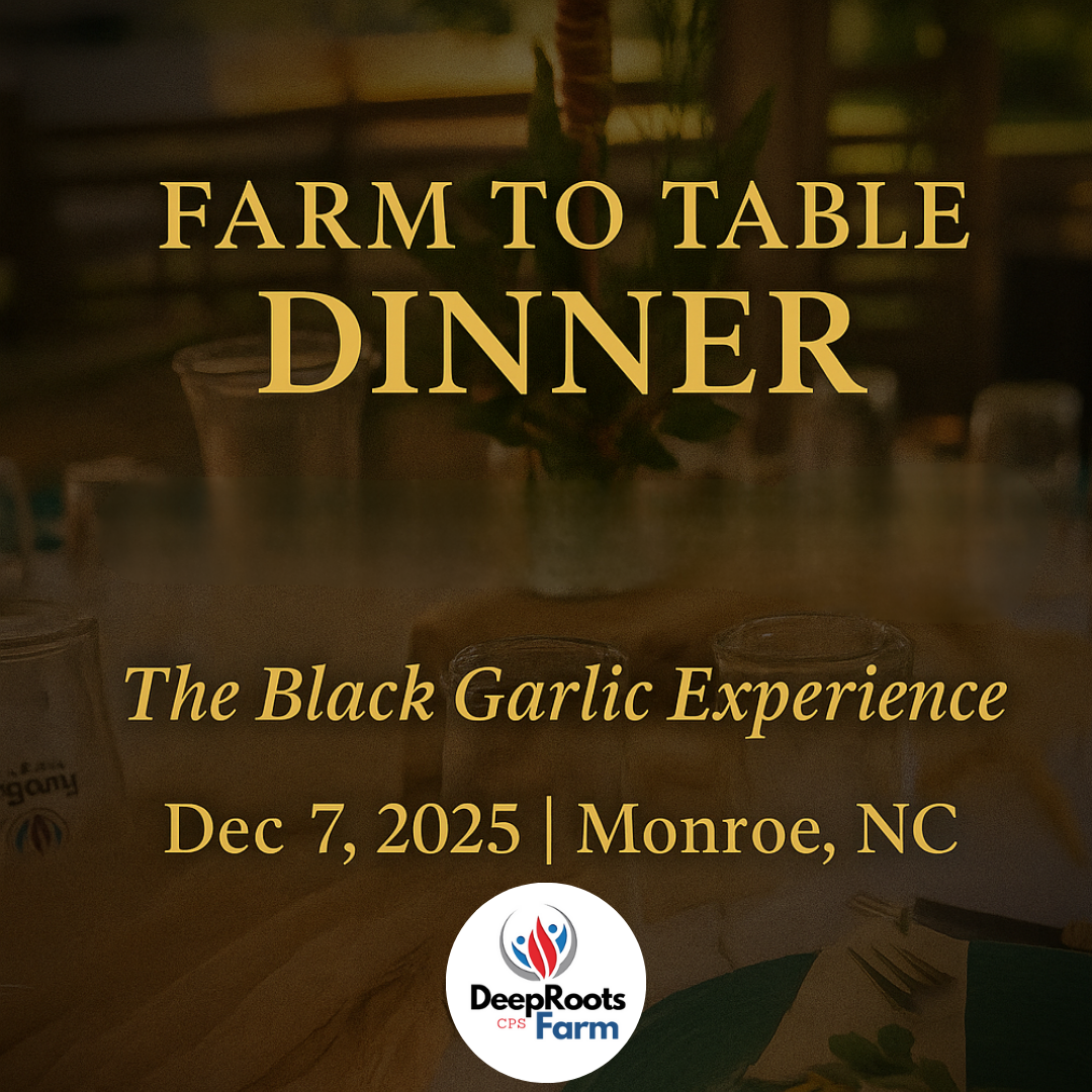 Join us as a sponsor for our Farm-to-Table Dinner on Sunday December 7, 2025, celebrating local food, sustainable farming, and community fellowship. This special evening brings together the best of what Deep Roots CPS Farm has to offer, fresh harvest from our farm in Charlotte and Monroe, prepared with care by amazing Chefs, and shared in the spirit of connection.